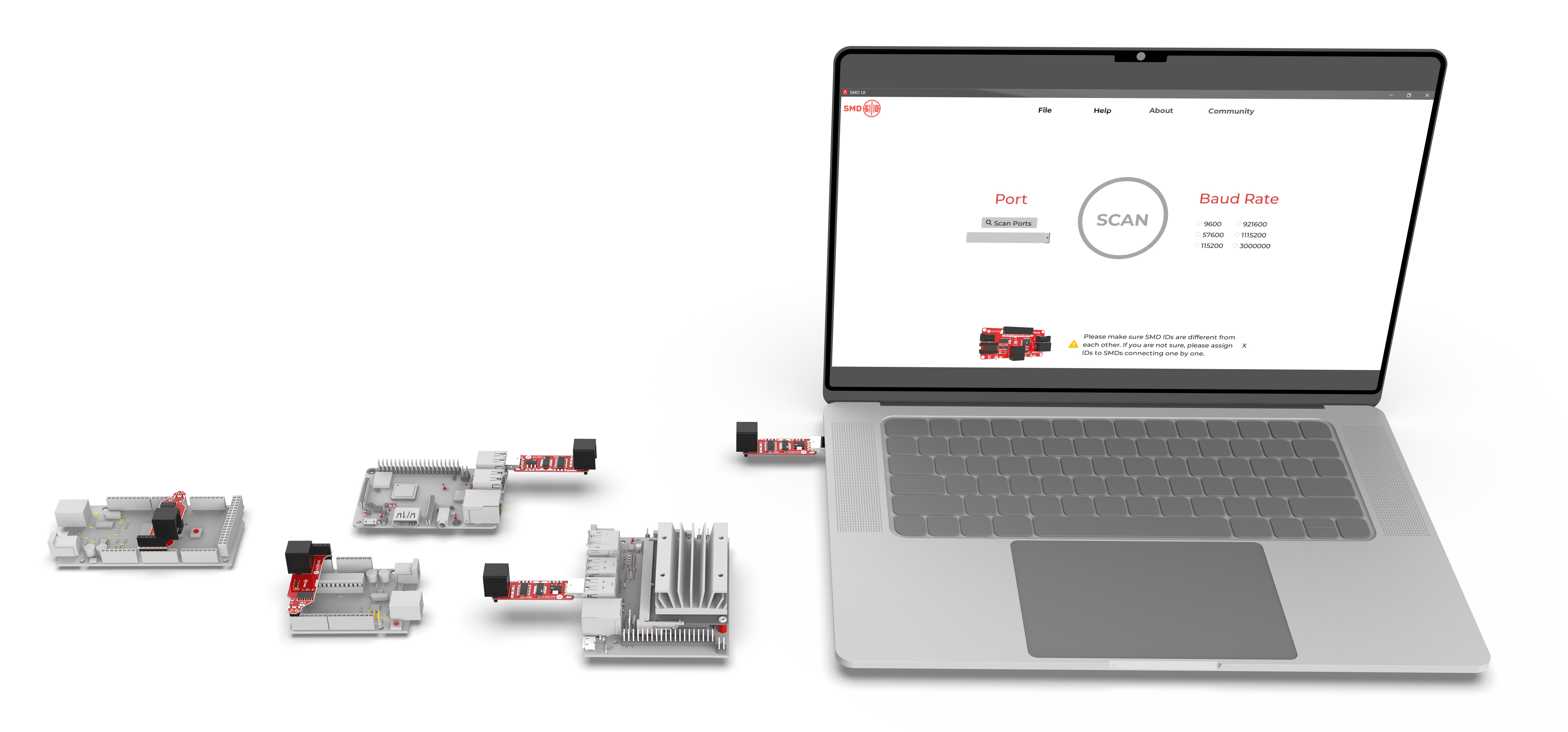 With USB Gateway and Arduino Gateway, you can connect SMD products to Raspberry Pi, Jetson, PC and Arduino. SMD motor driver cards drive the motor with the processor on it. This alleviates the processing load of the connected computer or microcontrollers.