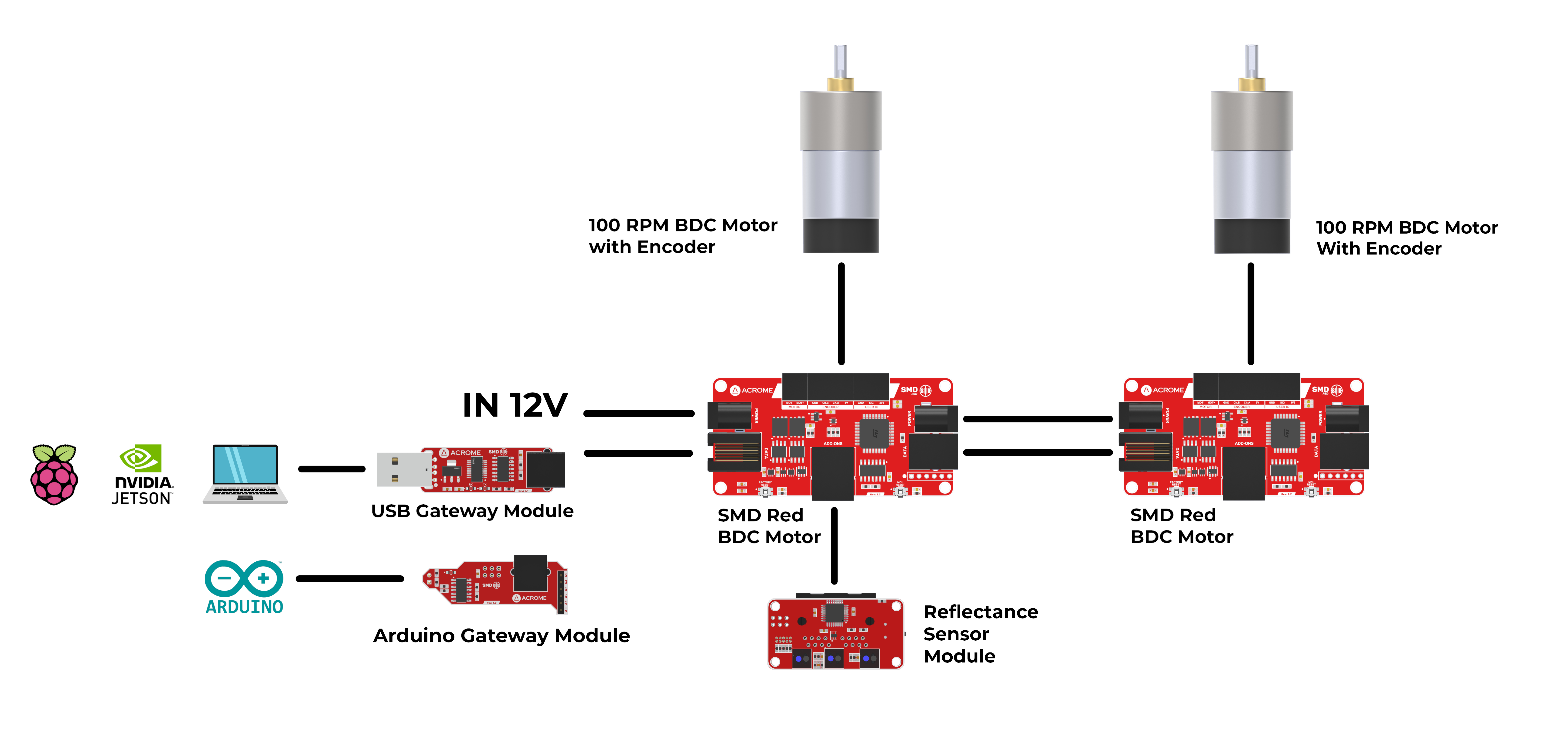 Connect the [SMD Red](https://docs.acrome.net/electronics/smd-red) to the PC or Arduino board using a [USB Gateway Module](https://docs.acrome.net/electronics/gateway-modules/usb-gateway-module) or [Arduino Gateway Module](https://docs.acrome.net/electronics/gateway-modules/arduino-gateway-module).