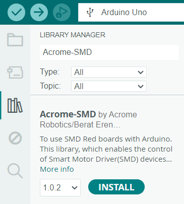2. In the Arduino IDE, go to `Sketch` -> `Include Library` -> `Manage Libraries...` or simply click the book stack icon on the left, and search for Acrome-SMD in the search bar.